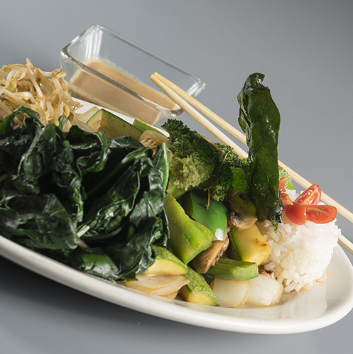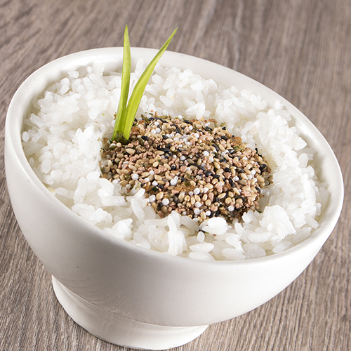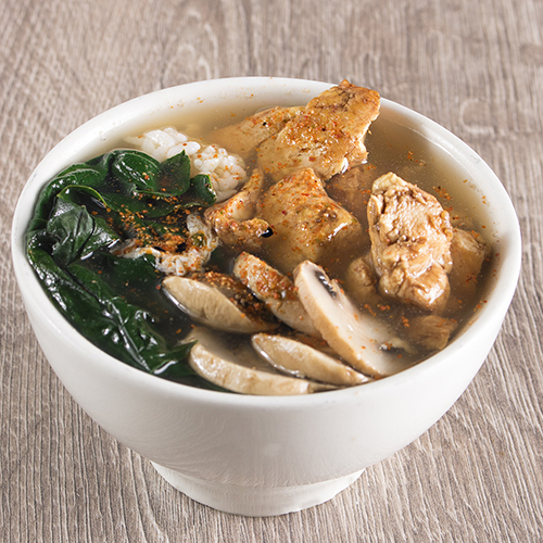 Pollo, campiñones, espinaca, hilos de huevo y gohan