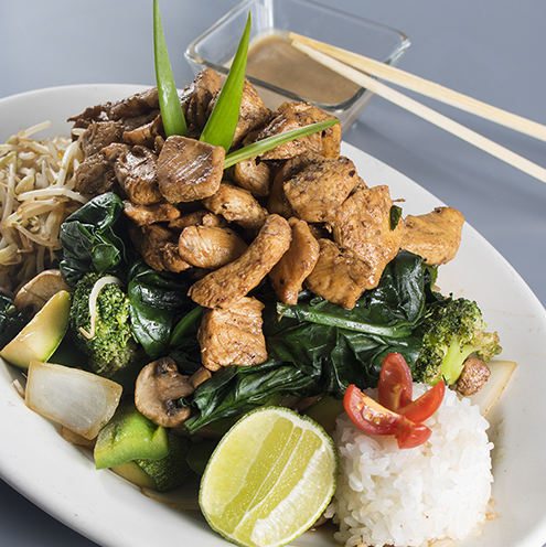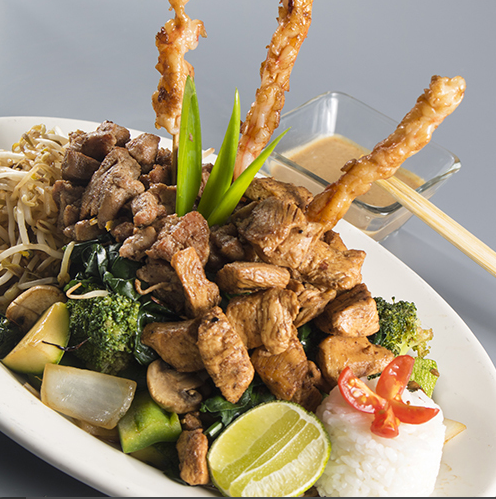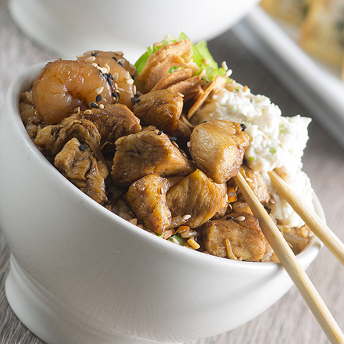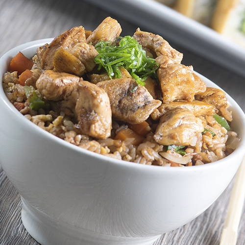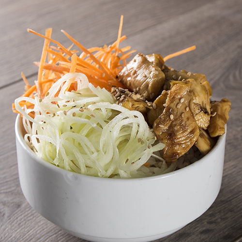 Arroz al vapor con pollo cubierto de salsa teriyaki, pepino y zanahoria