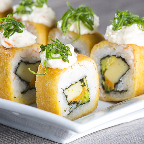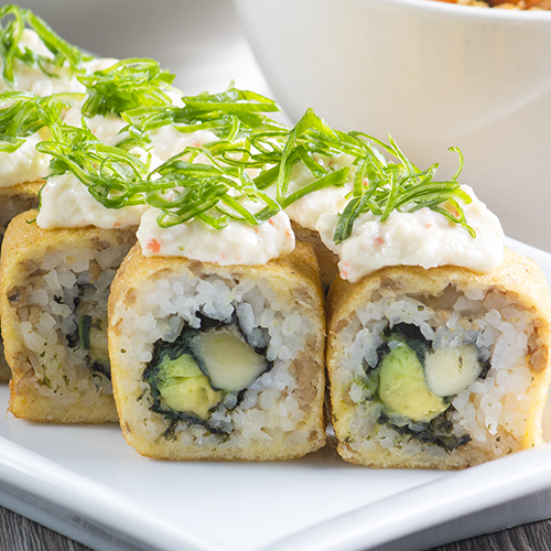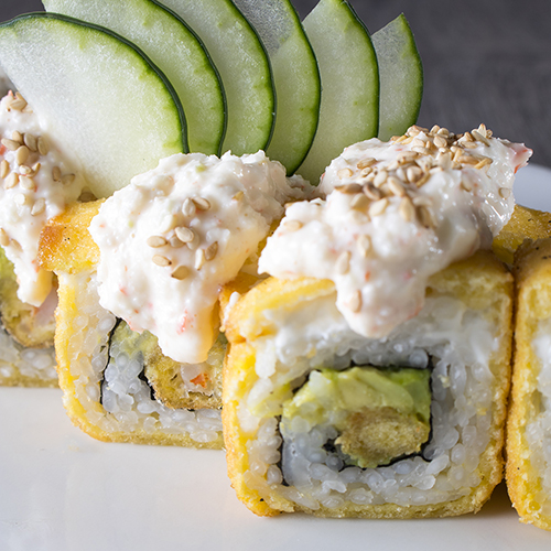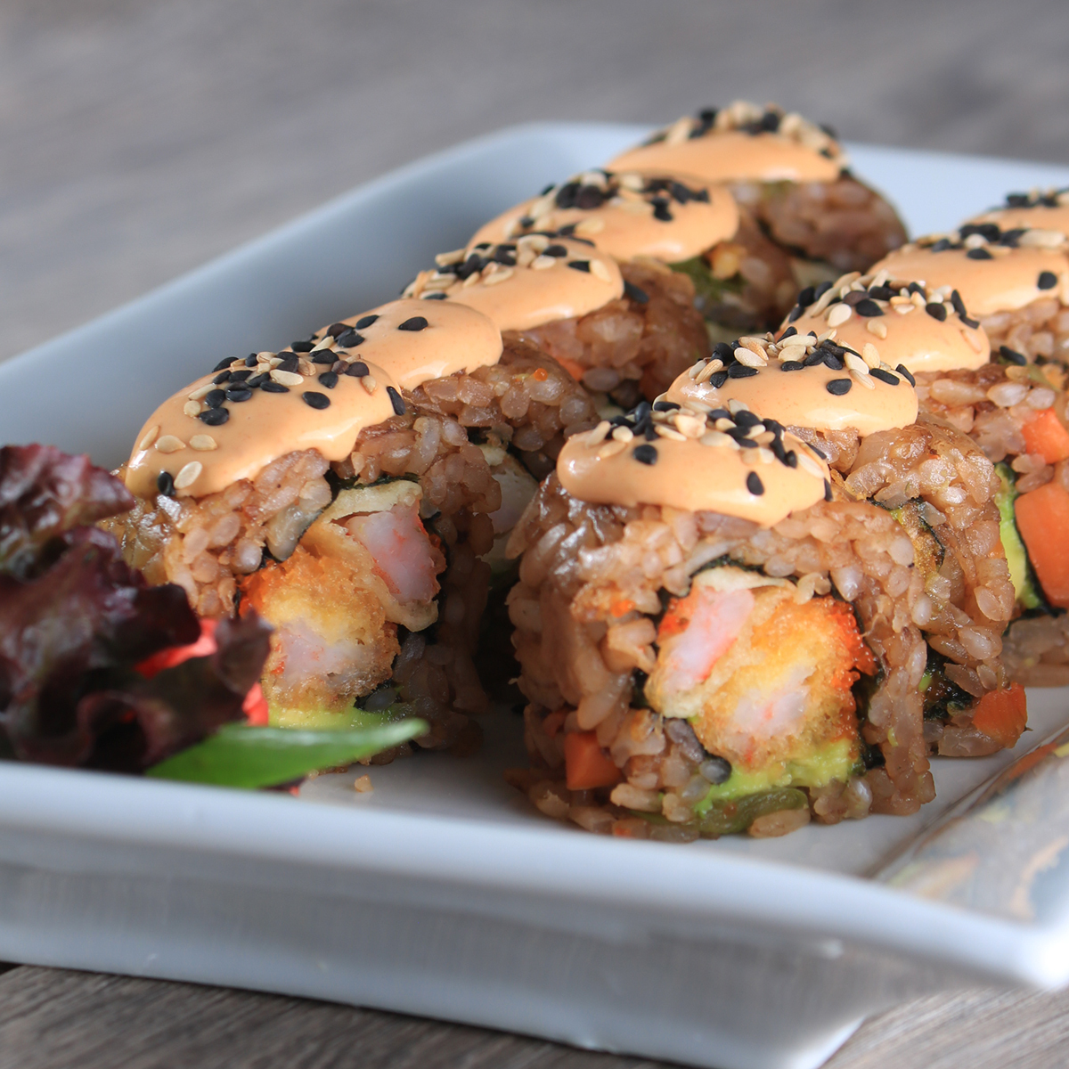 Arroz de yakimeshi, camarón capeado, camarón empanizado, masago, aguacate, salsa chipotle con mayonesa
