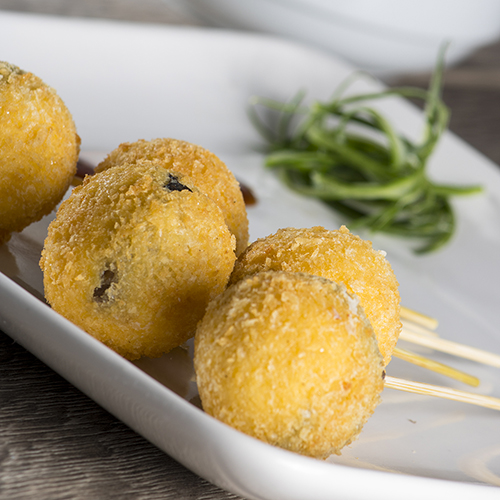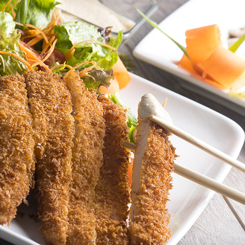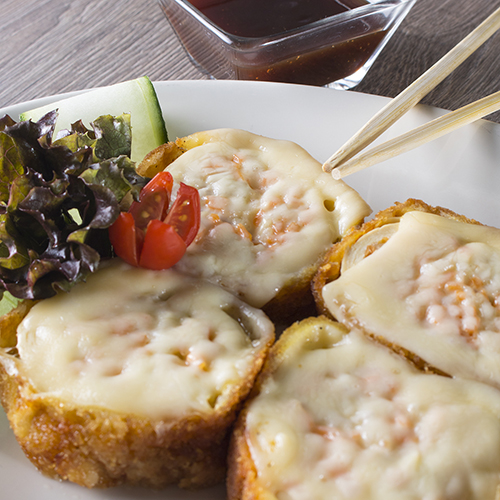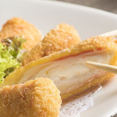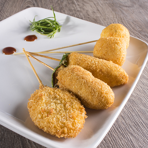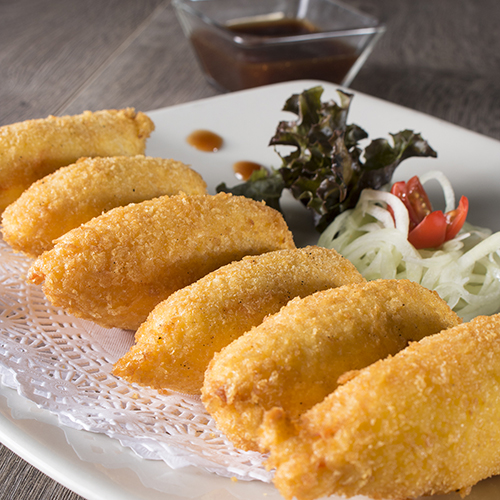 Camarón capeado, queso crema, plátano macho a la plancha, ajonjolí y chipotle con mayonesa