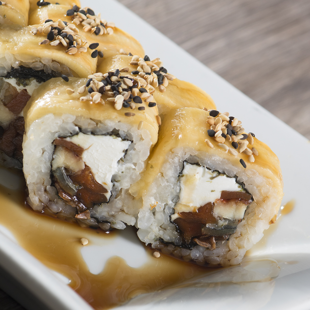 Anguila, queso crema, zanahoria dulce, cubierta de plátano macho, salsa dulce y ajonjolí