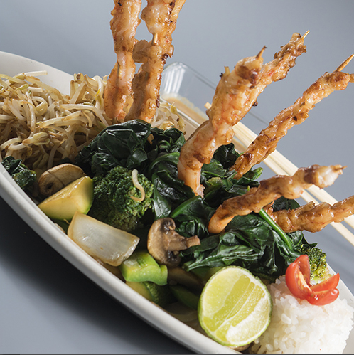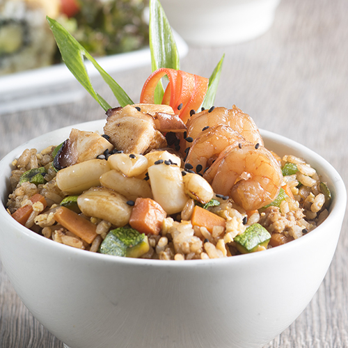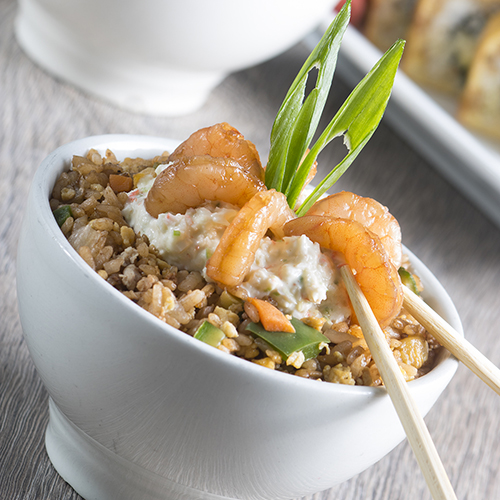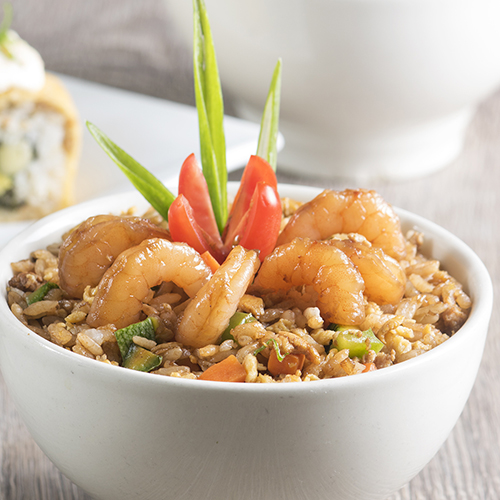 Arroz frito clásico con camarón, pollo, ajo macho, chiles toreados y aderezo de tampico