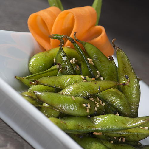 Queso crema, camarón, chiles toreados, cubierta de aguacate, salsa dulce y ajonjolí