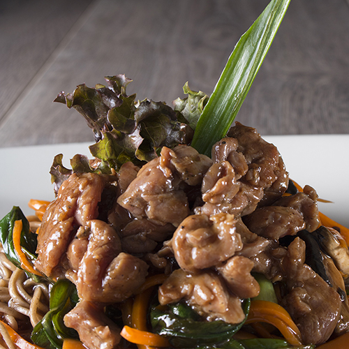 Pasta de soba, filete de res, zanahoria, champiñones, cebollín y salsa agridulce