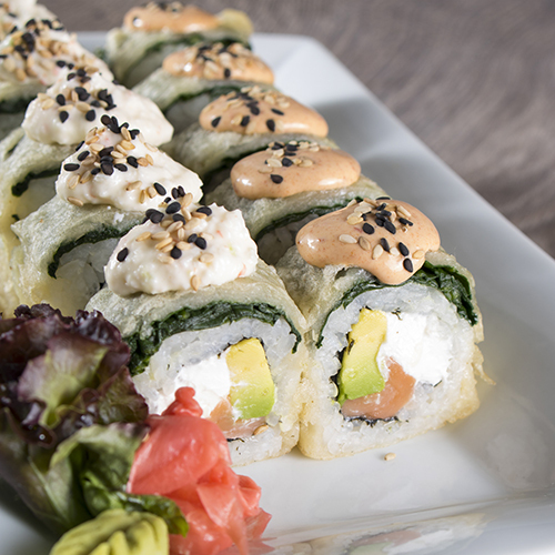 Espinaca capeada, salmón, queso crema, aguacate, tampico y salsa chipotle