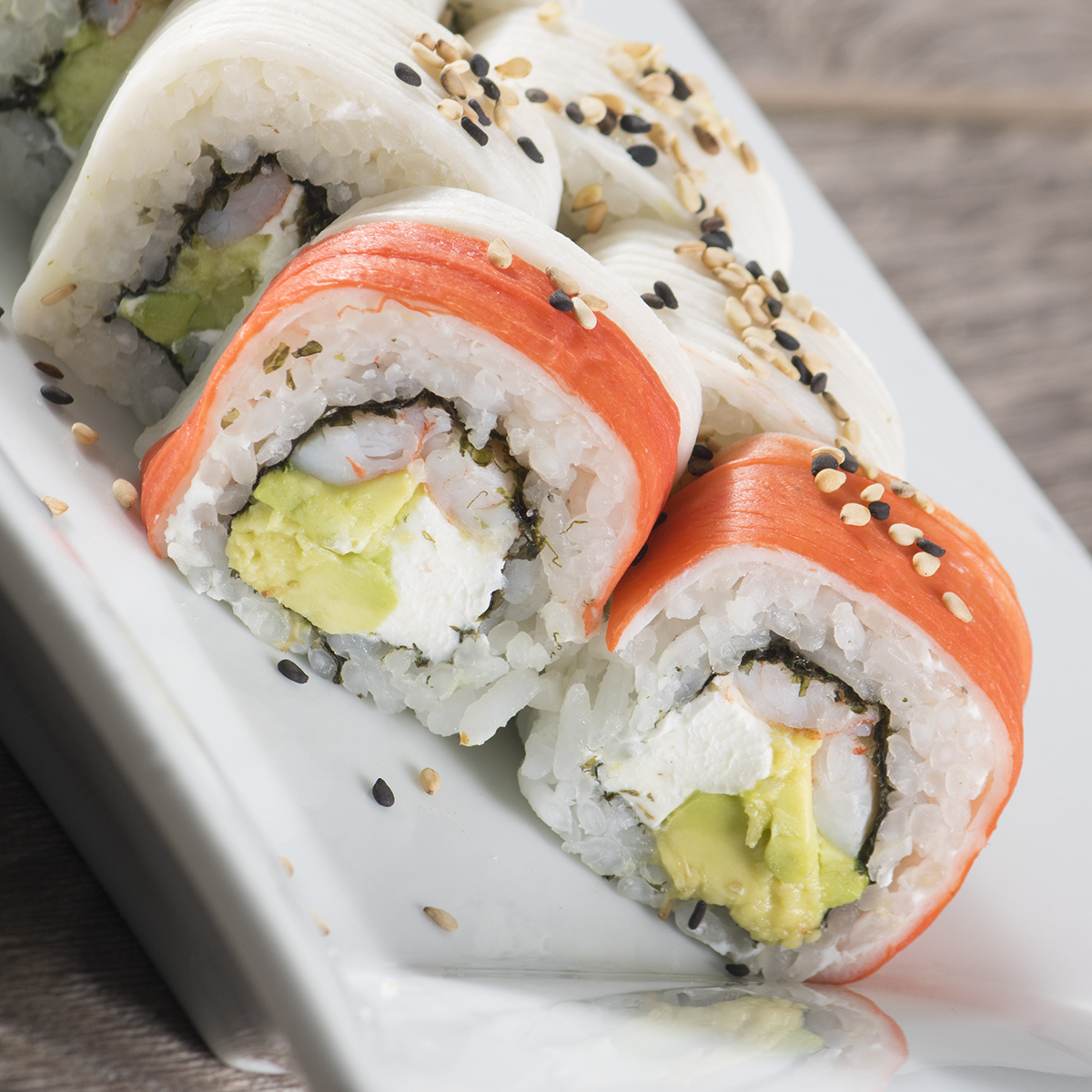Camarón, queso crema, aguacate, pepino, masago y ajonjolí