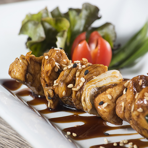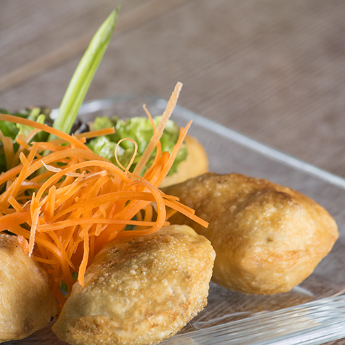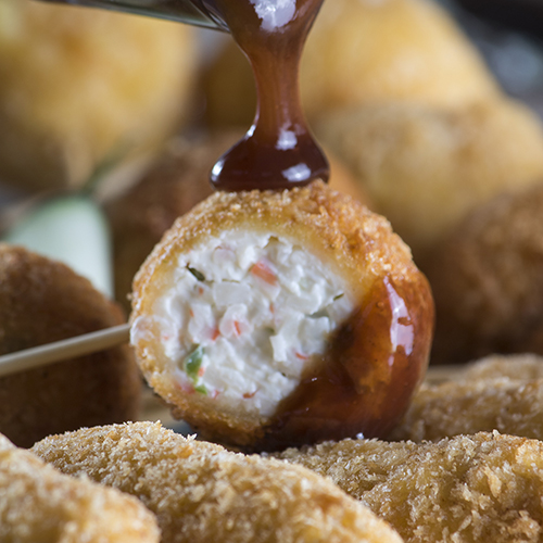 Surimi, aguacate, cubierta de plátano macho, chile mulato, salsa dulce y ajonjolí