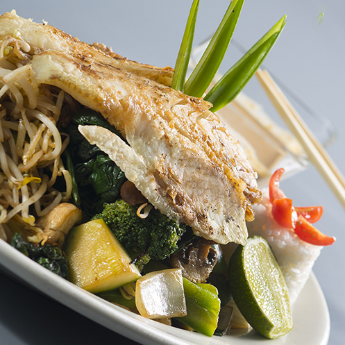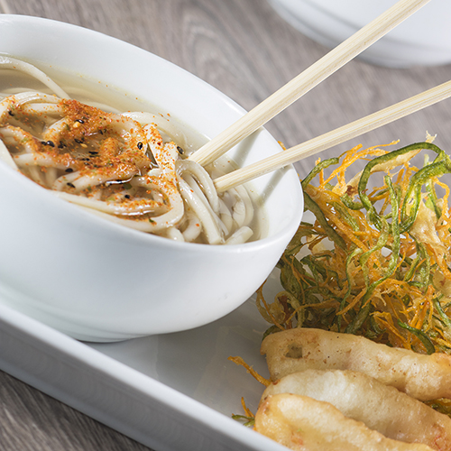 Salmón ahumado a la plancha, surimi, pasta baby squid, salsa dulce y condimento ebi