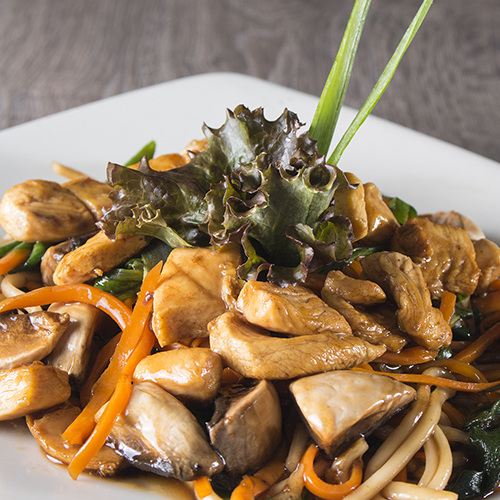 Pasta de udon, pollo, zanahoria, champiñón, cebollin y salsa agridulde