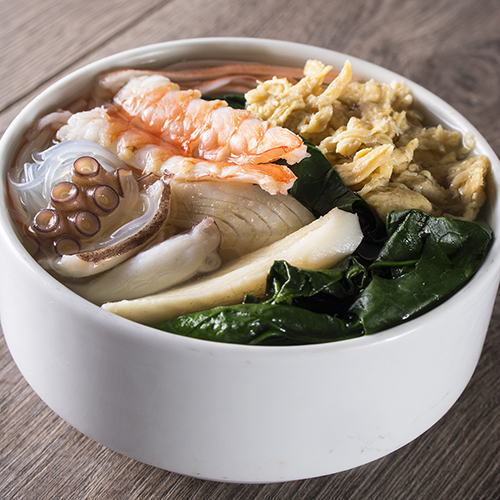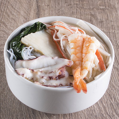 Pescado, pulpo, cangrejo, camarón, espinaca y fideo delgado