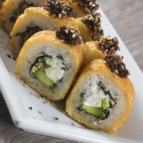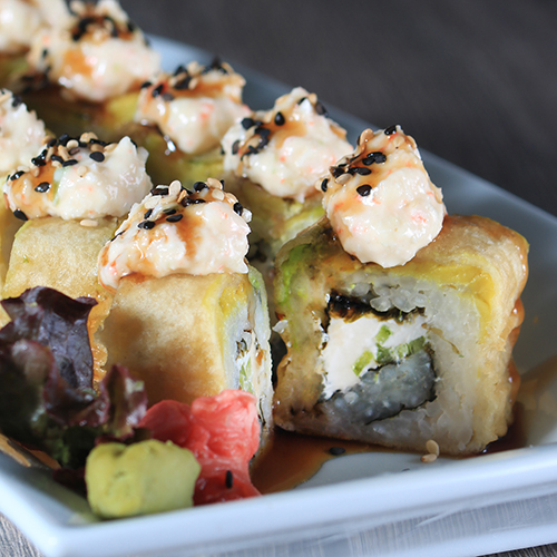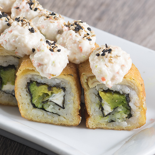 Surimi, queso crema, aguacate, kakiage, chiles toreados, cobierta de tampico y ajonjolí