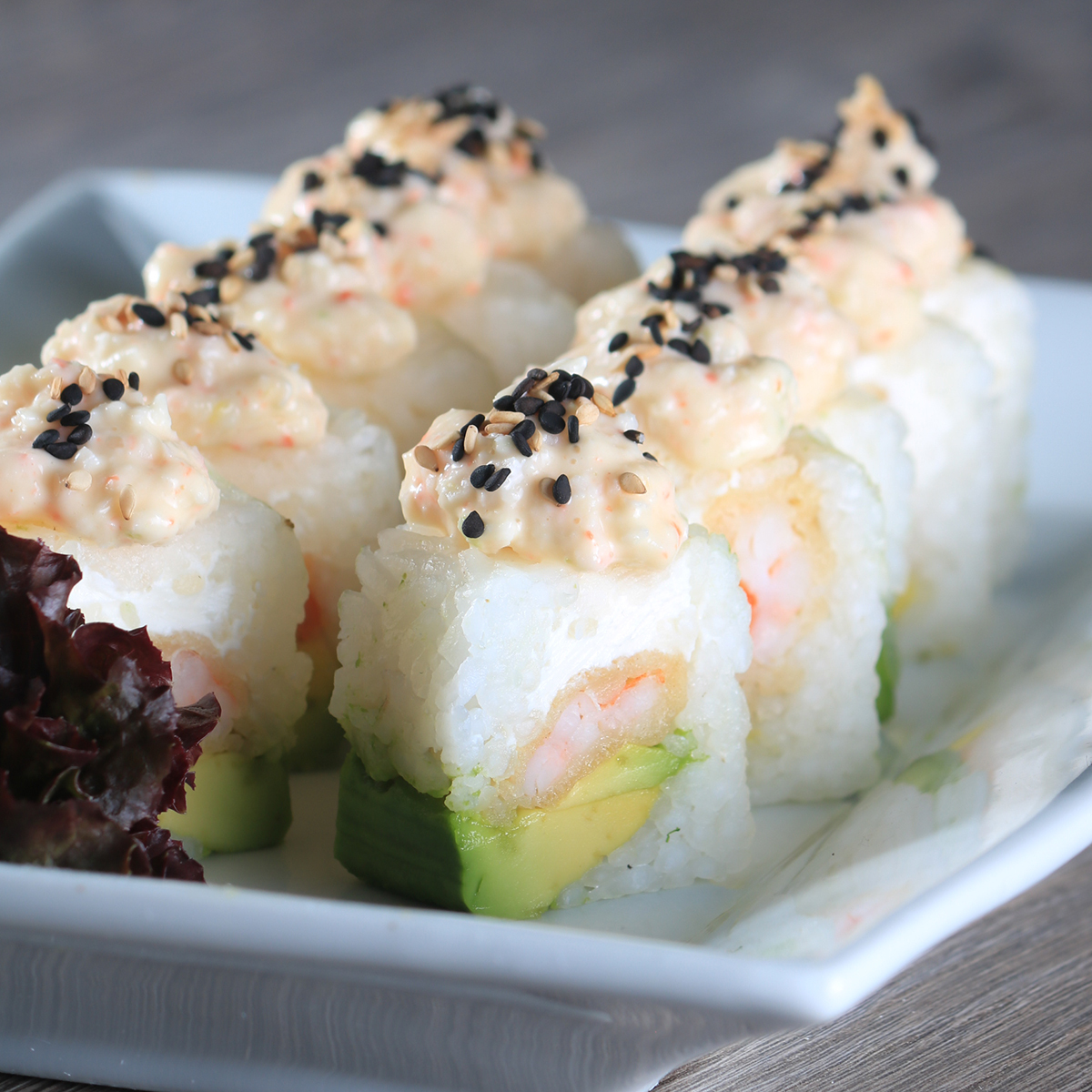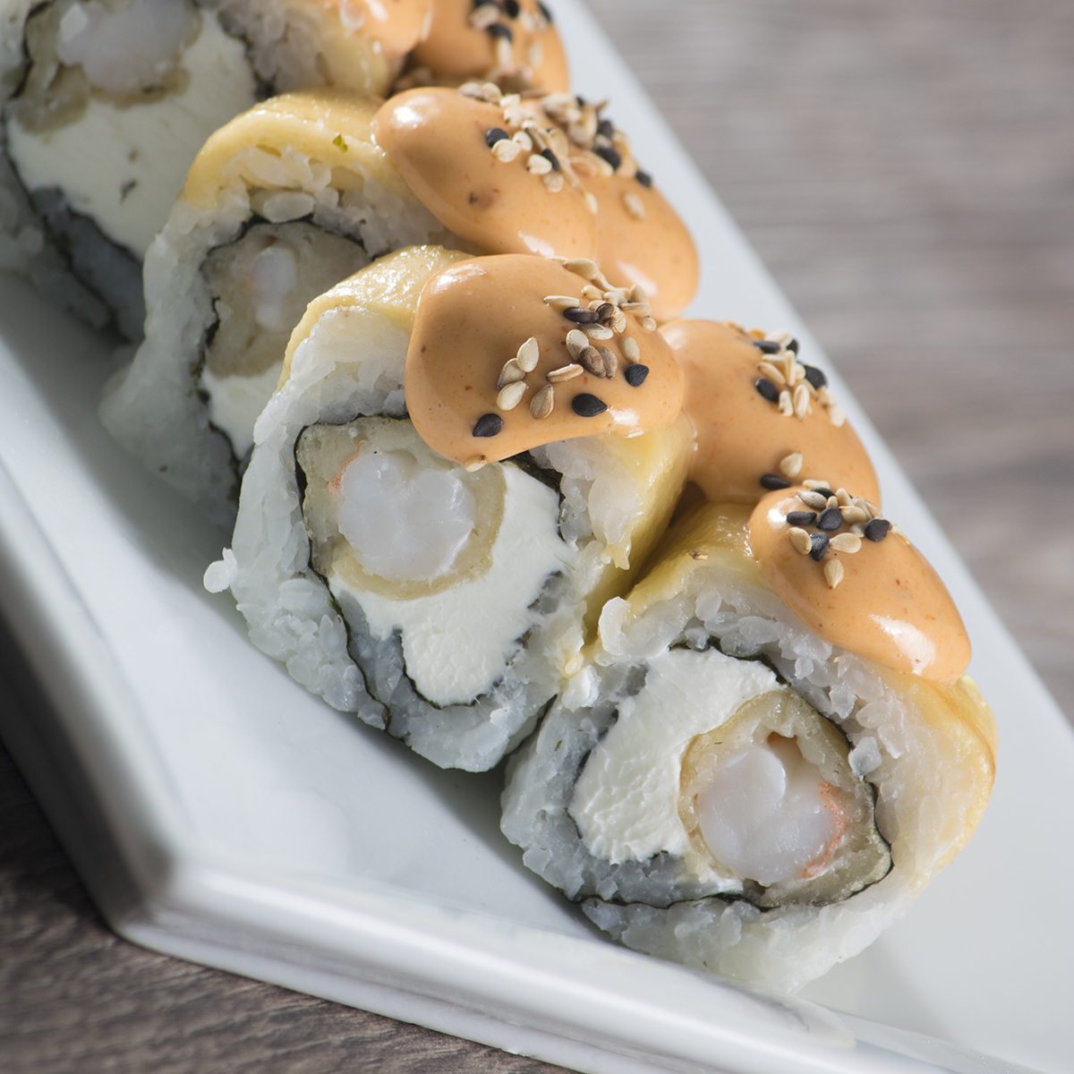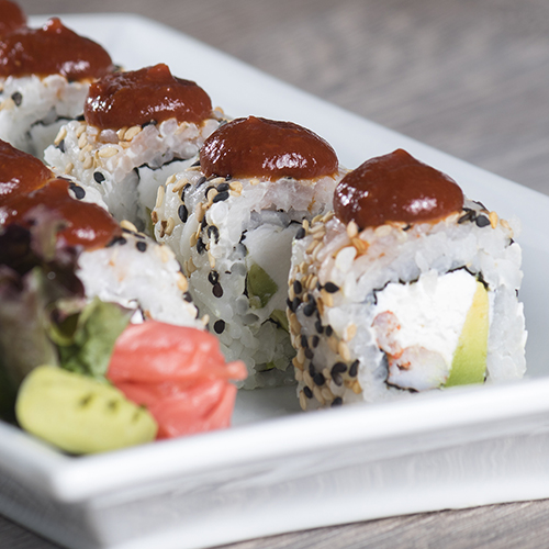 Camarón, queso crema, aguacate, salsa chipotle y ajonjolí