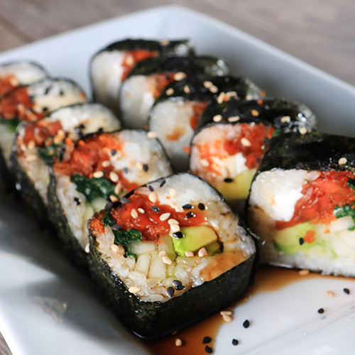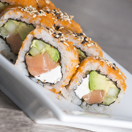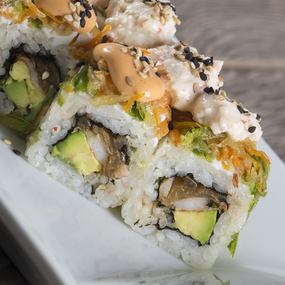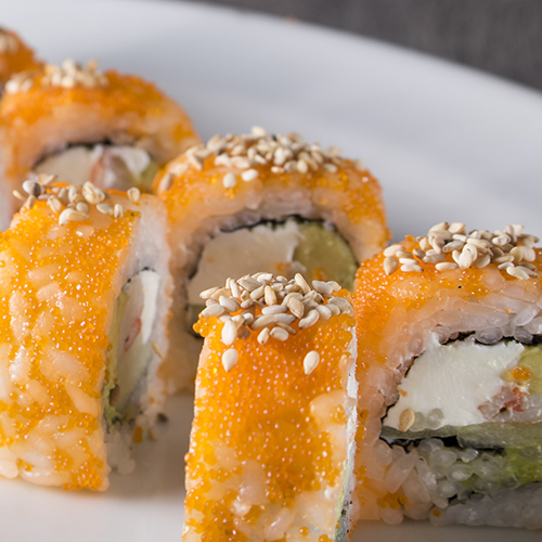 Zanahoria, aguacate, masago, queso crema, salsa dulce y ajonjolí