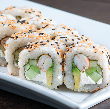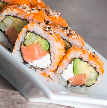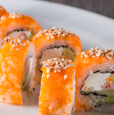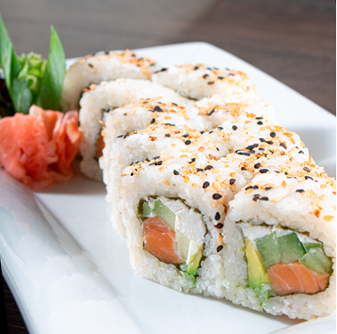 Salmón, queso crema, aguacate, pepino, masago y ajonjolí.