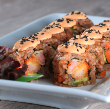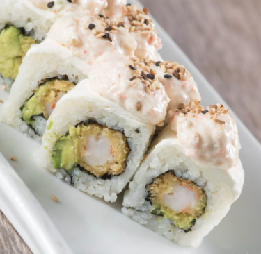 Arroz de yakimeshi, camarón capeado, camarón empanizado, masago, aguacate y salsa chipotle con mayonesa.