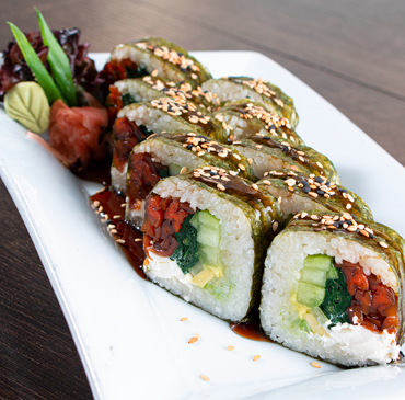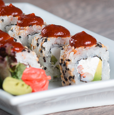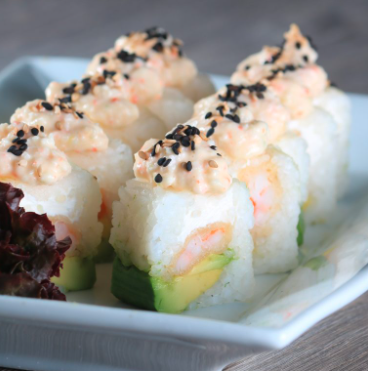 Camarón, queso crema, aguacate, salsa chipotle y ajonjolí.