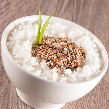 Arroz al vapor con condimento de camarón o salmón.