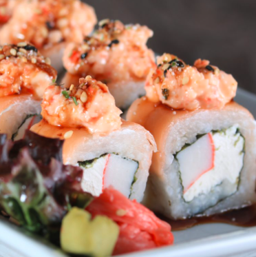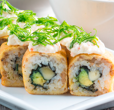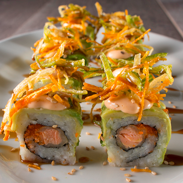Delicioso maki de salmón tempura, masago, aguacate, mayonesa con salsa shirasha, kakiage, salsa dulce y ajonjolí.