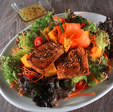 Salmón a la plancha acompañado de ensalada de lechugas mixtas, mango, zanahoria con jitomate cherry, aderezado con salsa de naranja, aceite de ajonjolí y miel