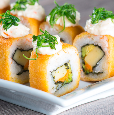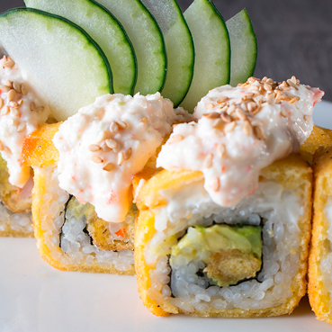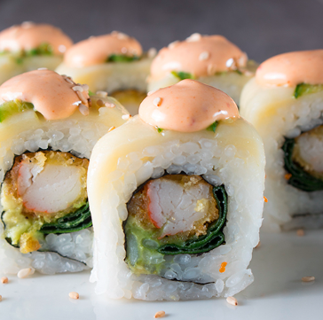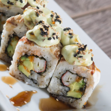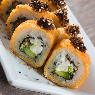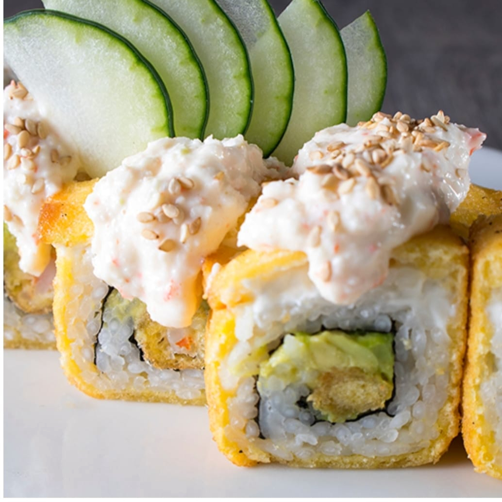 Rollo empanizado, camarón empanizado, queso manchego, cremoso de aguacate con mayonesa, salsa dinamita que es srirasha con mayonesa y masago, ajonjolí con salsa dulce.