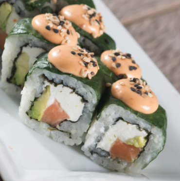 Salmón, queso crema, aguacate, cubierta de espinaca y chipotle.