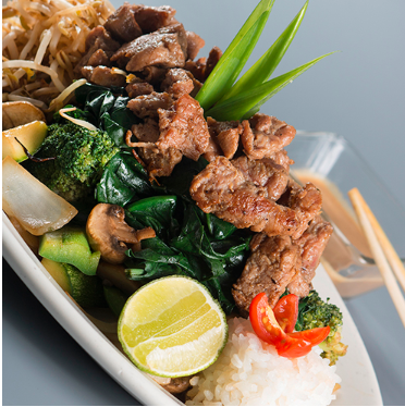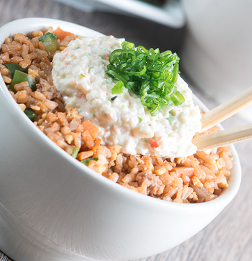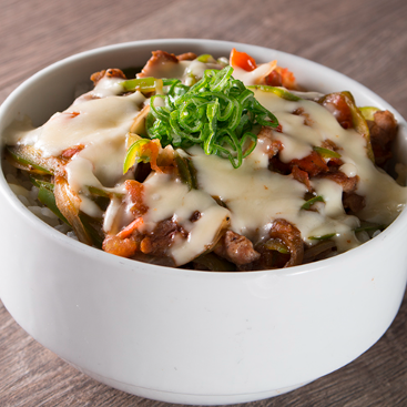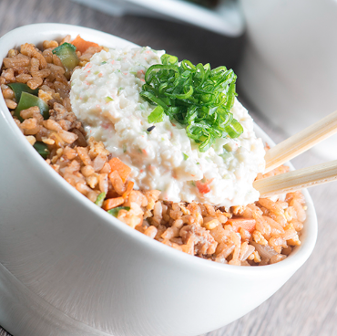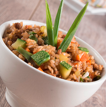 Arroz gohan con pimiento morrón, cebolla cambray, cebollín, queso manchego gratinado, aderezado con mirín y acompañado con exquisita arrachera.