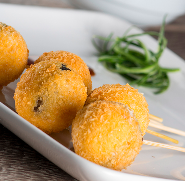 Brochetas de plátano macho con queso manchego.