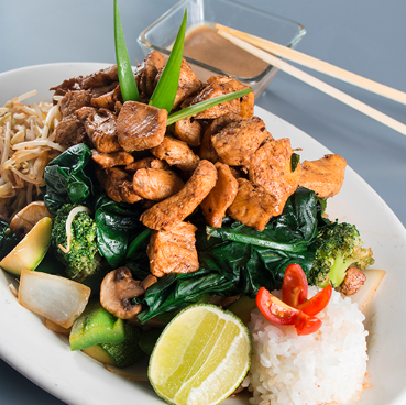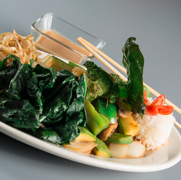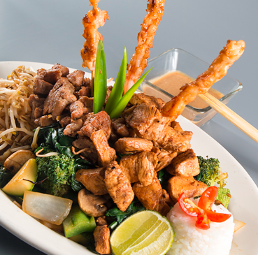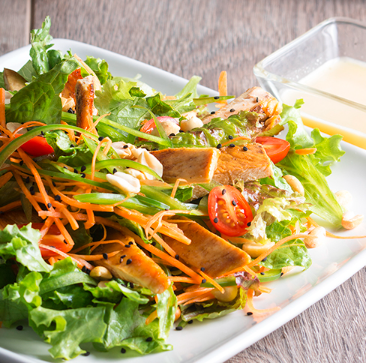 Lechugas mixtas, pechuga a la plancha, zanahoria, pimiento, jitomate y aderezo de miel con salsa de cacahuate.