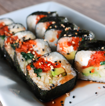 Zanahoria dulce, pepino, aguacate, pepino, masago, queso crema, salsa dulce y ajonjolí.