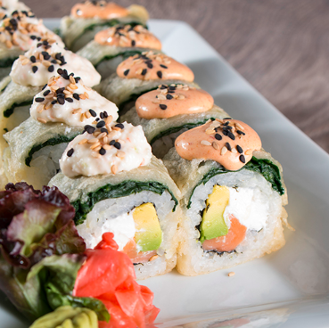 Espinaca capeada, salmón, queso crema, aguacate, tampico y salsa chipotle.