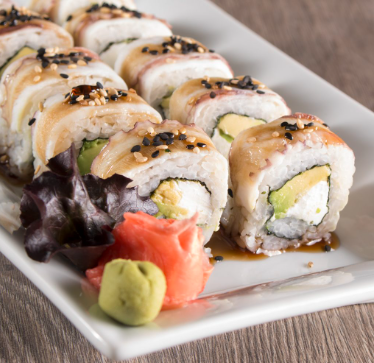 Anguila ahumada, camarón, queso crema, aguacate, salsa dulce y ajonjolí.