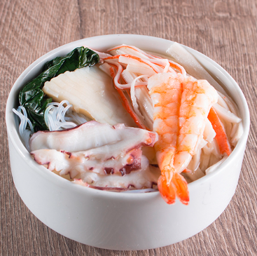 Pescado, pulpo, cangrejo, camarón y fideo delgado.