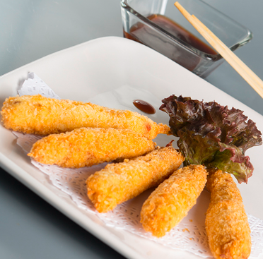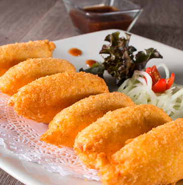 Surimi, aguacate, cubierta de plátano macho, chile mulato, salsa dulce y ajonjolí.