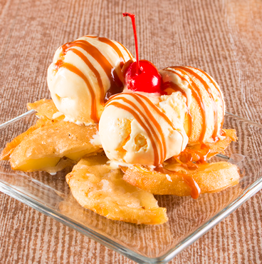 Manzana capeada, helado de vainilla y cajeta.