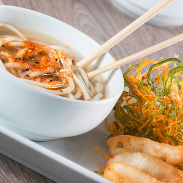 Pasta udon acompañada de kakiage y camarones rebosados.