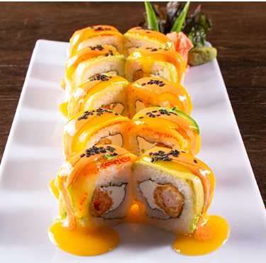 Camarón empanizado, queso crema, aguacate, mango, masago, salsa de mango, salsa srirasha con mayonesa y ajonjolí garapiñado.