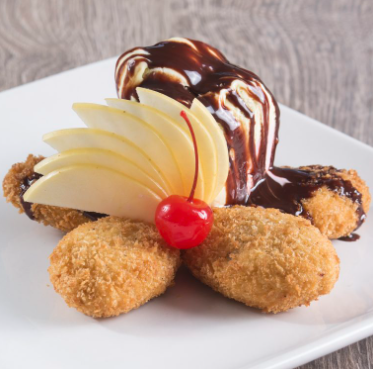 Plátano macho empanizado, helado de vainilla y chocolate.