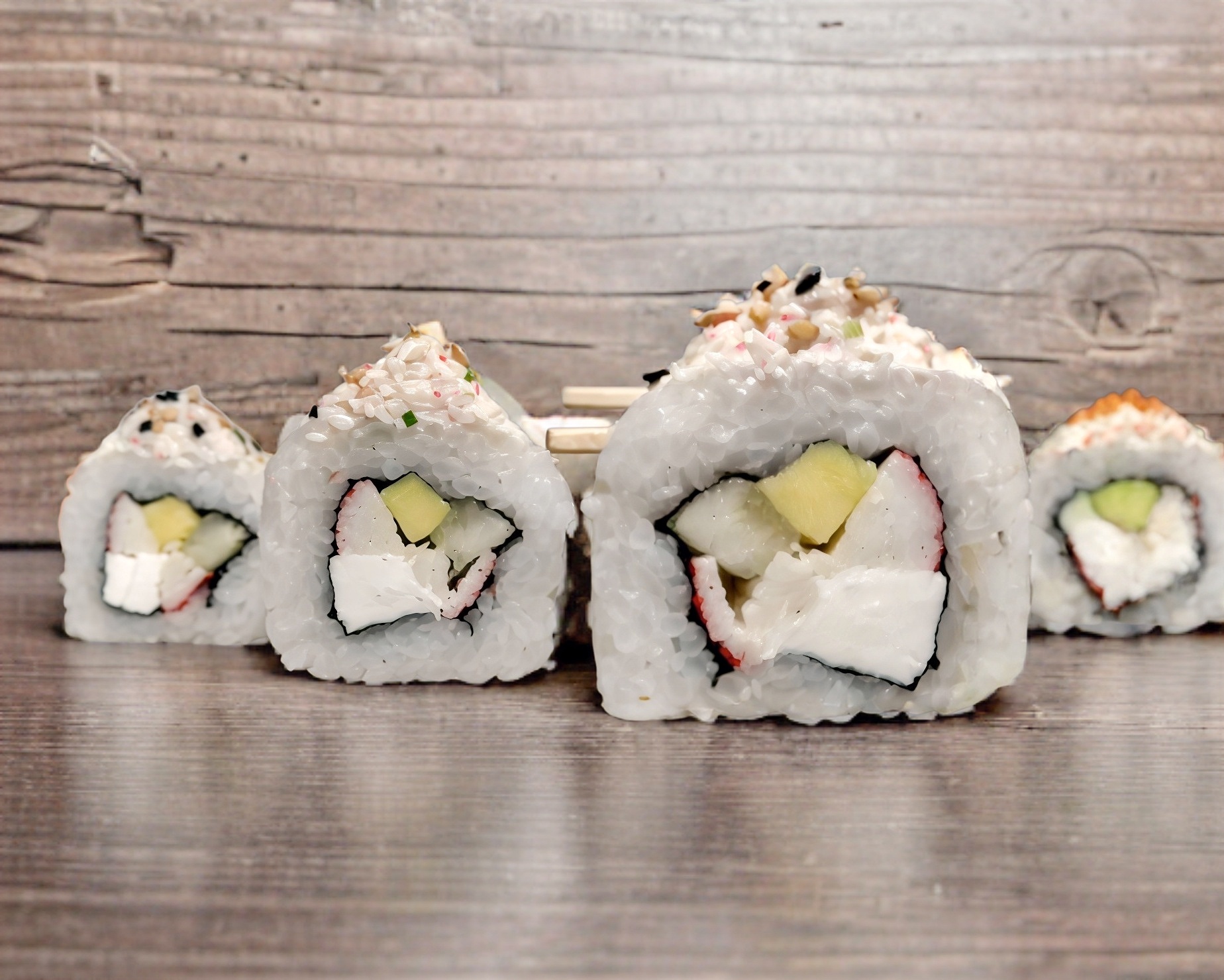 P.F. Philadelphia y salsa de anguila P.D. Aguacate, pepino y surimi