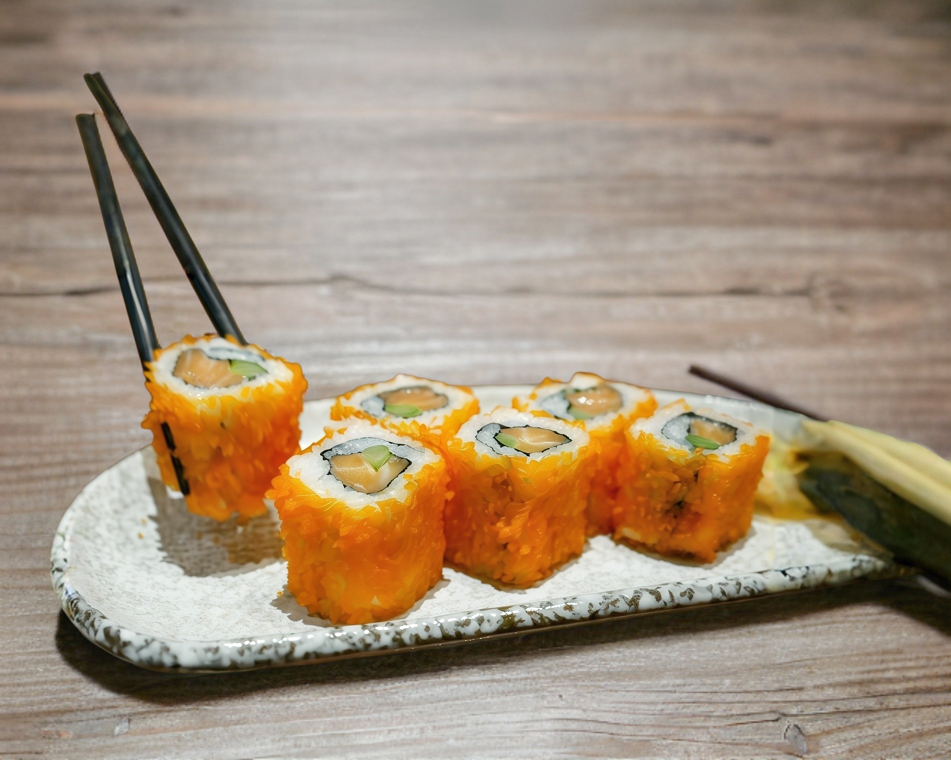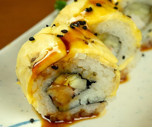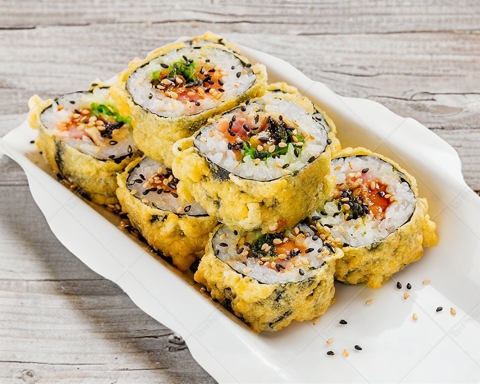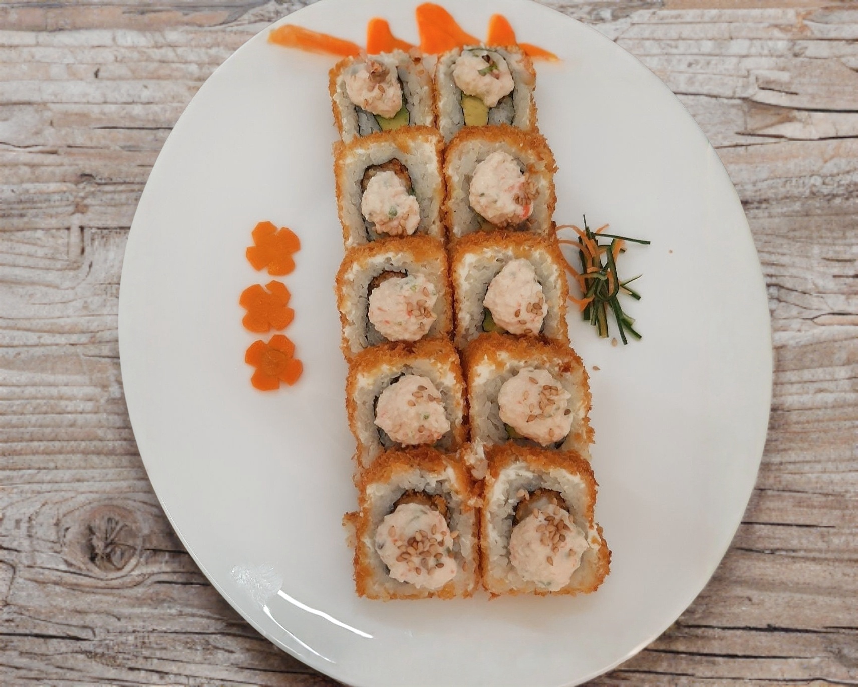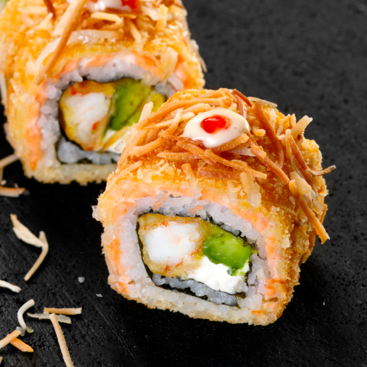 P.F. Alga empanizada P.D. Queso, pepino, aguacate, camarón y cangrejo