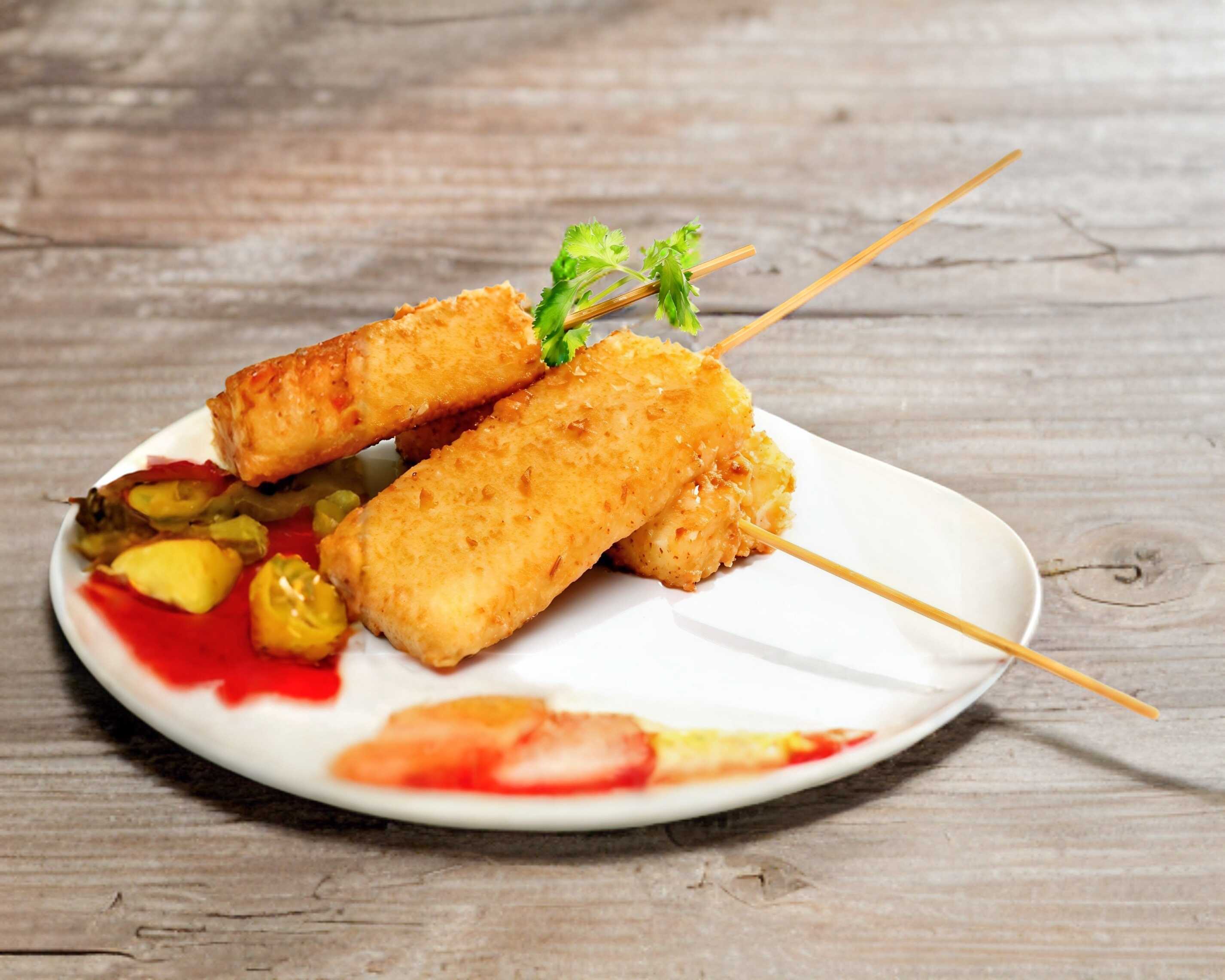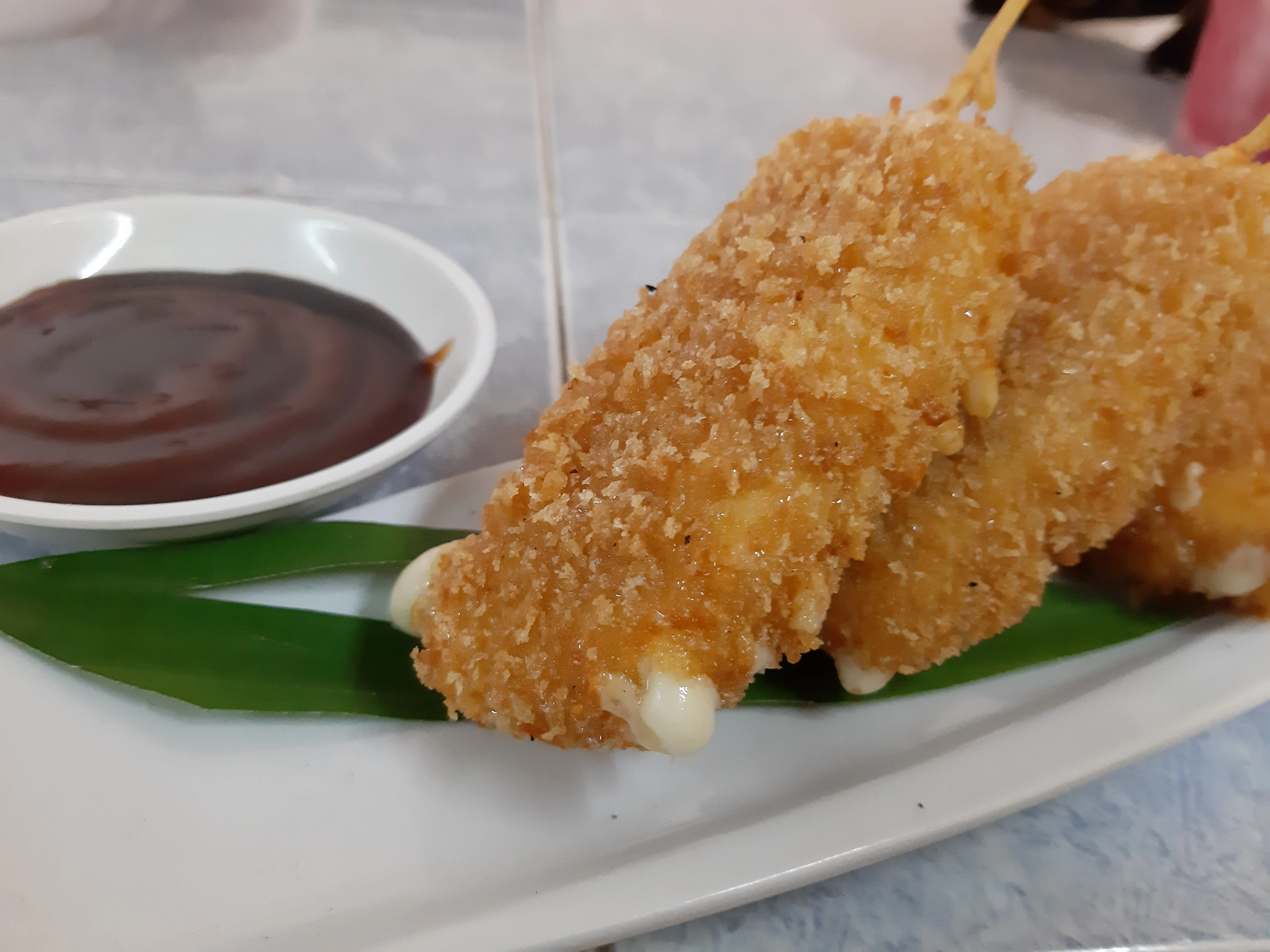 P.F. Plátano macho empanizado y salsa de tamarindo P.D. Queso, pepino y camarón