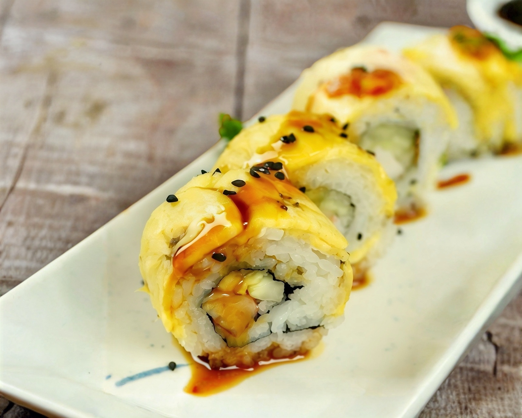 P.F. Capeado, tampico y salsa de anguila P.D. Camarón tempura, aguacate y pepino