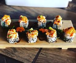 P.F. Perlas de tempura con shichimi bañado en salsa agridulce P.D. Aguacate. pepino y salmón tempura