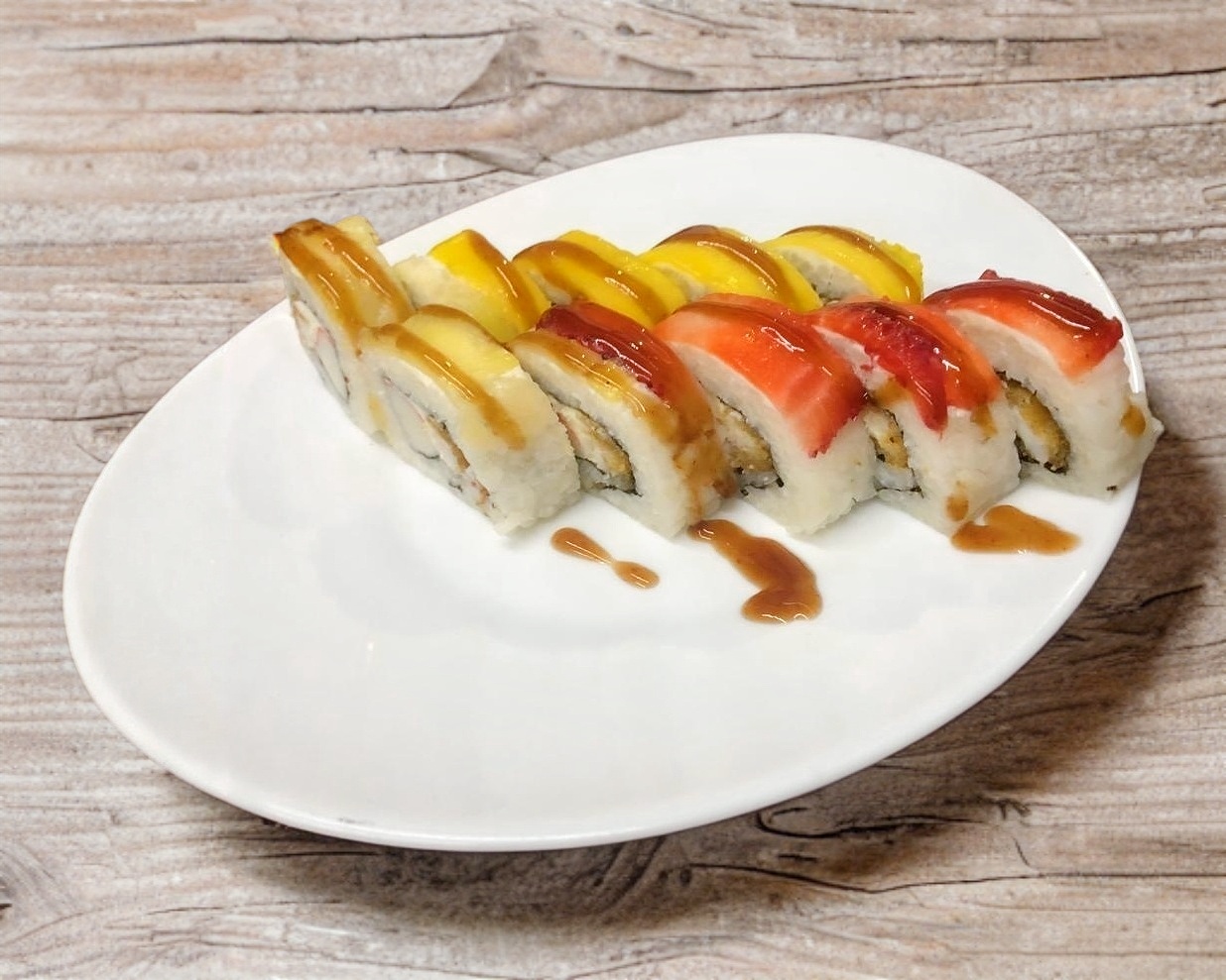 P.F. Mango, aguacate y salsa de tamarindo P.D. Queso, camarón empanizado y surimi