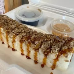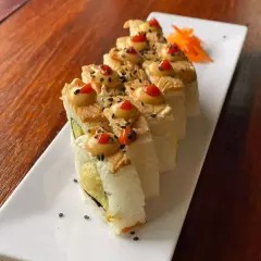 Bola de arroz al vapor empanizada, rellena de tampico, queso philadelphia, mozzarela, bañada en salsa de anguila
