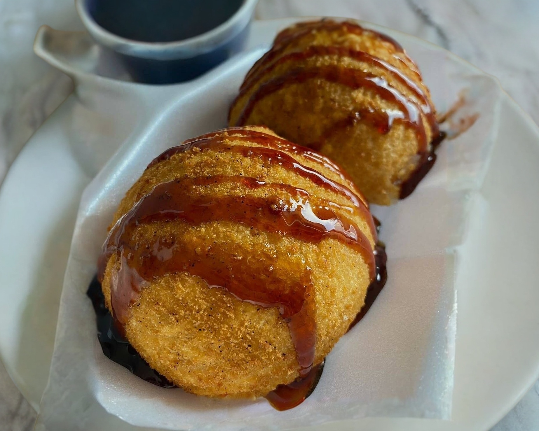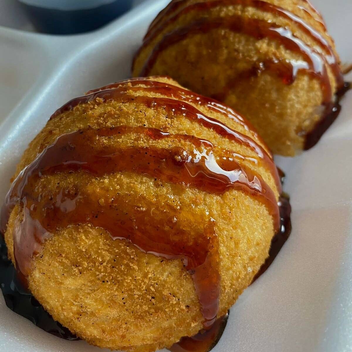 Bola de arroz al vapor empanizado, relleno de queso philadelphia, mozzarella, tampico, proteína a elegir, bañada en salsa de anguila.