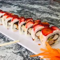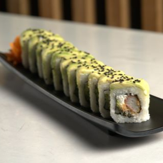 Pd: philadelphia, aguacate, pepino, camarón y res, pf: gratinado, bañado en aderezo chipotle y un toque de ajonjolí.