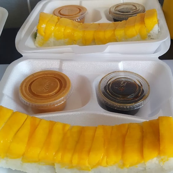 Pd cangrejo empanizado, envuelto en mango, durazno; pf bañado en salsa de anguila, y decorado en ajonjolí todos los rollos incluyen philadelphia, aguacate y pepino por dentro todos los rollos incluyen philadelphia, aguacate y pepino por dentro.
