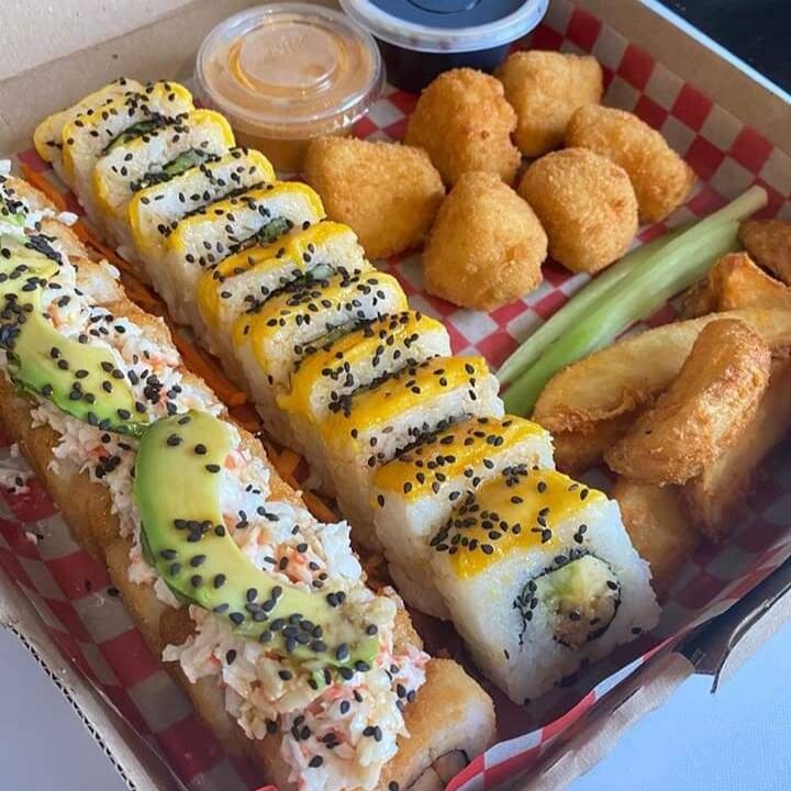 2 Rollos a elegir del menú (aplican rollos especiales y rollos naturales), media orden de boneless , 125 g de papas sazonadas gajo, soya, chipotle, zanahoria y bastante pepino.