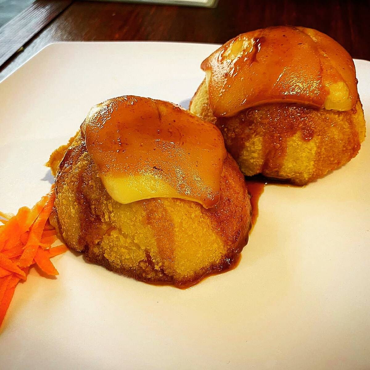 Bola de arroz al vapor empanizado, relleno de queso philadelphia, mozzarella, tampico, bañada en salsa de anguila.