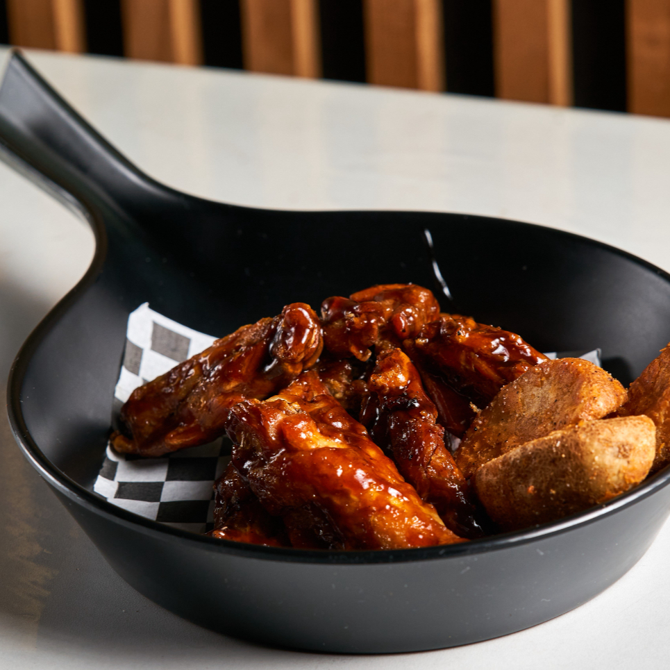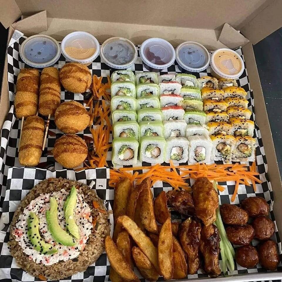 3 rollos(Mango´s roll, Sea roll Natural, Mar y tierra); 1 yakimeshi tradicional, media orden de boneless BBQ, 200 g de papas gajo, 3 pz de kushi crab, media orden de alitas BBQ, 3 pz de baby onigiris de queso, zanahoria y pepino, aderezo y chiles toreados.